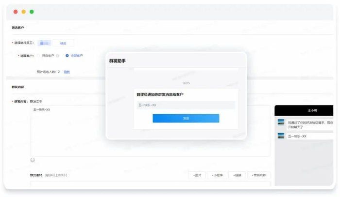 导购的会员营销能力普遍偏弱,工作时间有限,所以,运营同学将产品推荐、营销活动等内容,上传到探马后台的「营销内容」中,再利用「客户群发」功能下发“群发任务”。销售会在企微收到群发消息的提醒,点击即可发送给所有客户。