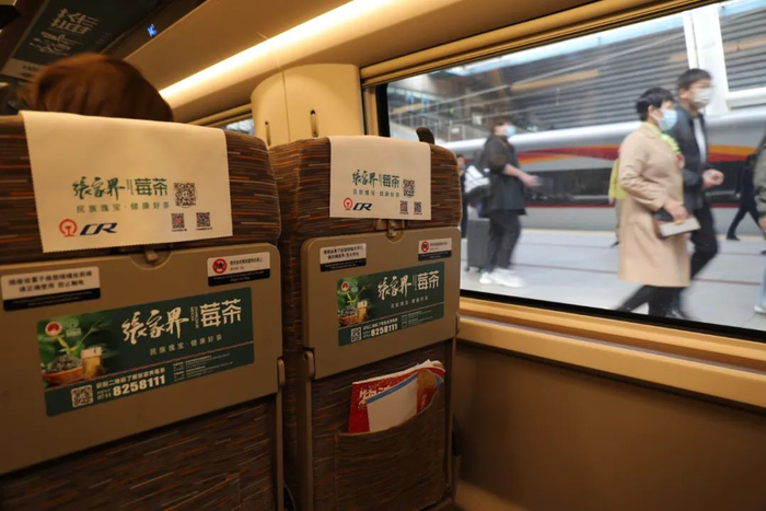 登上张家界莓茶高铁专列,车厢内的展牌、行李架和座椅桌贴都印有张家界莓茶的宣传标语,随处可见的张家界莓茶品牌元素,让整列高铁成了张家界莓茶的移动展示馆。此趟列车是由北京西站开往广州南的G339次列车,满载张家界莓茶品牌元素的列车将广泛触达北京、天津、石家庄、郑州、武汉、岳阳、长沙、衡阳、郴州、韶关、广州、上海、杭州、南京等十多个省市。