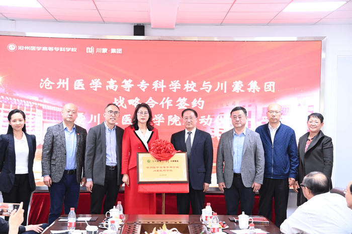 沧州医专党委书记刘健与川蒙集团董事长张新共同签署了战略合作协议并为“川蒙医药学院”揭牌。