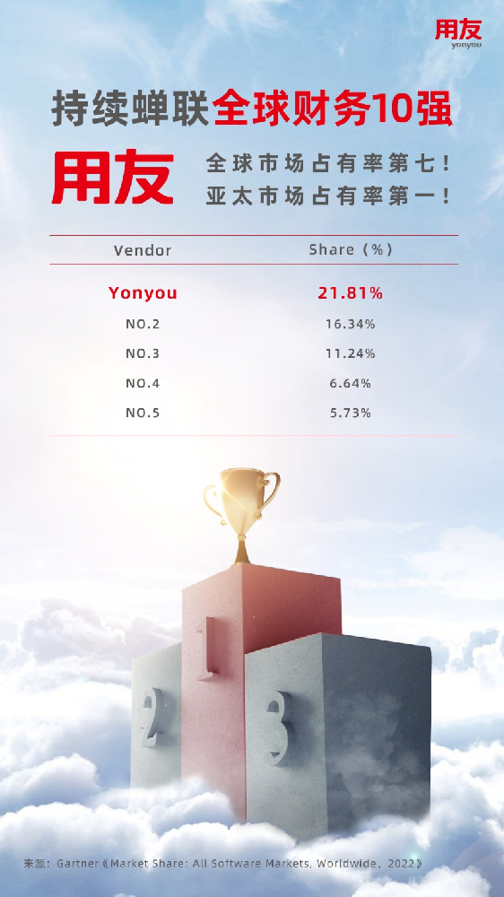 近日,全球权威信息技术研究和顾问公司Gartner最新发布《Market Share: All Software Markets, Worldwide,2022》报告,用友在财务(FMS)市场占有率位居全球第七位,亚太第一位!且用友连续多年入选全球10强,标志着用友已迈入全球领先行列!