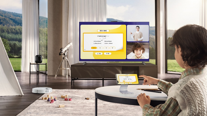同时,华为智慧屏 S3 Pro超级投屏还提供众多细分投屏方式,匹配消费者多元场景需求。孩子使用平板、笔记本学习时,可以使用分布式投屏,将学习内容投屏到智慧屏上,学习更护眼。凭借鸿蒙分布式技术,还可以调用智慧屏的摄像头与麦克风,轻松与老师互动。使用智慧屏健身时,可以通过分屏投屏,将手机的健身应用分屏到智慧屏上,一屏两用,边运动边煲剧,健身刷剧两不误。另外,用户在开会、授课、商务交流的场景下,可以使用华为智慧屏S3 Pro进行PC投屏,还可通过智慧屏遥控器反向操控换页,助力用户开会、授课、会议等场景。
