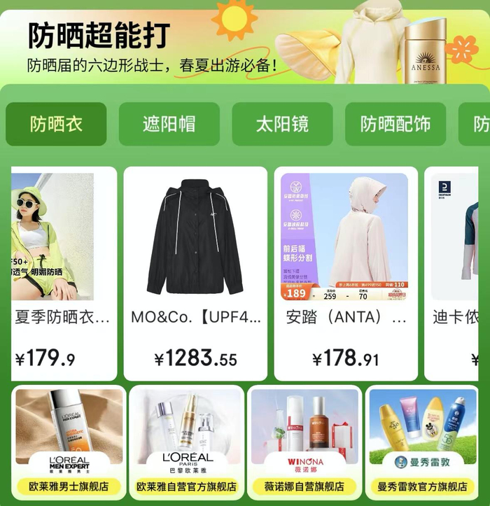 对于防晒产品,消费者已不再满足于基础防晒功能,个性化、科技感、精细化趋势逐渐显现。不但要兼顾高科技面料和时尚剪裁,还要对身体各个部位实现精准防晒。出游季会场防晒专区汇集蕉下、VVC等专业防晒品牌的防晒衣、遮阳帽、护眼角口罩、冰袖,以及安热沙小金瓶、资生堂蓝胖子等面部防晒好物,满足消费者户外出行时的多元化防晒需求。
