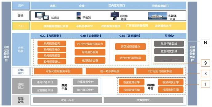 好视通以自主创新的核心音视频能力和标准化的SDK及API为基础,借鉴省级可视化服务平台“粤视会”项目的成功经验,制定了一套符合宝安区政数局需求的方案:通过依托宝安区政务外网,搭建1个可视化服务平台,面向市民、企业、政府部门,构建9个应用场景,通过实施“可视化+”计划,探索更多领域的可视化应用。