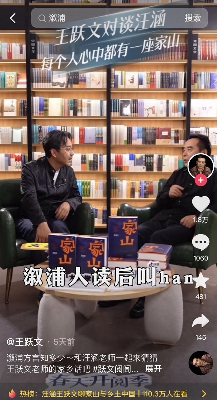 此次对谈在抖音、西瓜视频同步上线,吸引了超过140万人次观看。直播中,王跃文特别带来了自己的新书《家山》,畅聊作品背后的创作故事。