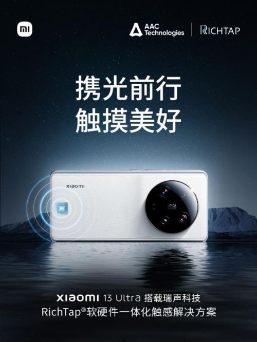触觉体验上,小米13 Ultra搭载瑞声科技RichTap®软硬件一体化触感解决方案,为用户带来旗舰机都有的高品质触感体验。小米13 Ultra所配备的瑞声科技大体积高性能X轴马达,具有强劲的综合性能优势,在RichTap®触感解决方案的调校下,其启停速度可达到行业领先水平。小米13 Ultra搭载的RichTap®触感解决方案已与多款国民级内容应用深度合作,涵盖目前行业最广的触感生态,可让用户体验到包含各类手游、影音、社交等软件中的高品质触感效果。