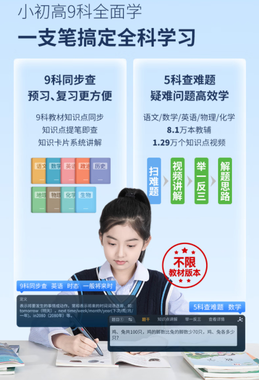 另外,阿尔法蛋AI词典笔T20作为T系列的代表产品,还在于它的产品功能覆盖范围广泛,从小学到高中九门学科的课本知识都囊括其中,扫一扫就能获得知识点,高效又准确。这意味着它的覆盖面更广,也为阿尔法蛋T系列破百万提供了更多的支撑。