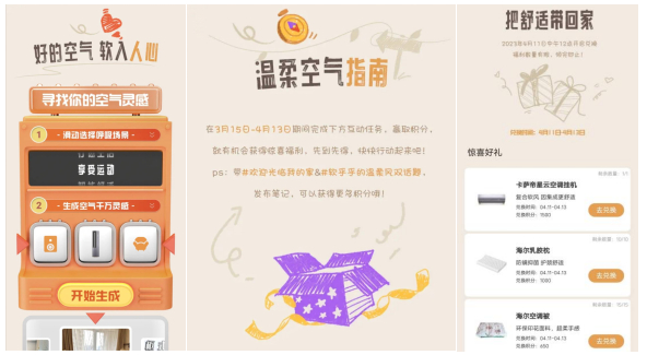 作为本次活动的合作品牌,卡萨帝空调准备了超多惊喜福利。上小红书搜索#软乎乎的温柔风 ,点击进入活动H5即可获取随机场景搭配。完成每日打卡、浏览相关话题、分享话题页等任务获取积分即可兑换产品,操作简单,奖品丰厚,极大调动了用户参与的积极性。助力品牌拉新引流,品牌口碑、品牌种草力得到进一步提升。