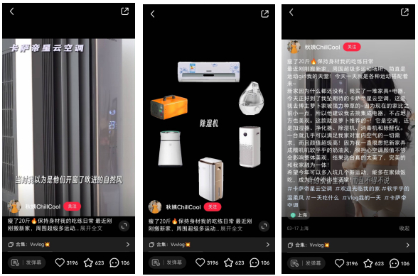 而作为@萝卜树下 视频的共创者,@秋姨ChiilCool 视角则更全面直接地剖析了卡萨帝星云空调的优点——复合软风,又软又健康。作为一个健康自律的健身博主秋姨对空气质量有着高标准高要求,视频为做客@萝卜树下 家的后续,也更具有真实性。视频中着重强调了卡萨帝空调是集空调、加湿器、净化器、除湿机、消毒机、除甲醛机于一体的全能型智能产品,从实用功能角度切入完成产品种草。
