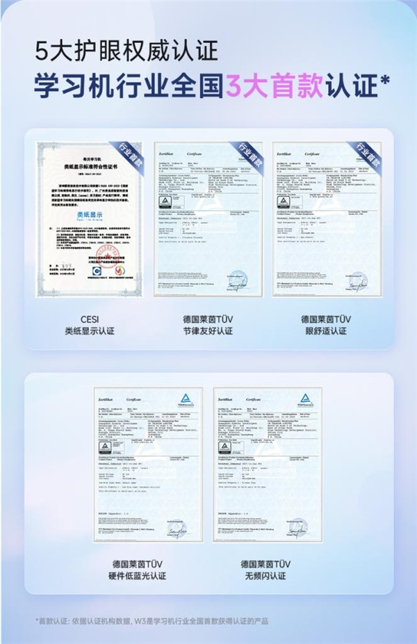 为了更好规范学习终端的类纸显示技术,深圳赛西近期发布的T/SUCA 039-2022《透射型学习终端类纸显示技术规范》除了对电子屏光学特性作出要求,还加入了蓝光检测、屏闪检测等与护眼息息相关的要求。希沃W3采用3A类纸护眼工艺,高度模拟教科书纸张的舒适观感,获得了CESI类纸显示认证,也是国内学习机行业首款获得该认证的产品。据统计,希沃学习机W3拿下了国内学习机行业3大首款认证,包括CESI类纸显示认证、德国莱茵TÜV节律友好认证、德国莱茵TÜV眼舒适认证等三大项,还获得了德国莱茵TÜV滤蓝光、低频闪等权威认证。