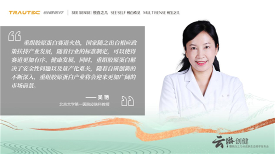 创健医疗总裁钱松指出,胶原蛋白已有数千年的应用史,随着科学与认知的高度发展,我们迈入重组胶原的崭新阶段。创健医疗坚持“让科技贴近生命,创造健康未来”为发展使命,“重组胶原蛋白”项目的研发水平、生产质量及下游开发应用已达国际领先水平。将牢记初心使命,践行责任担当。希望借助此次重要活动,搭建产、学、研、用一体化的交流沟通平台,融合新技术、新医学、新美学、新运营、新理念,推动新模式、新生态的探索,为医美行业的创新与发展贡献力量。