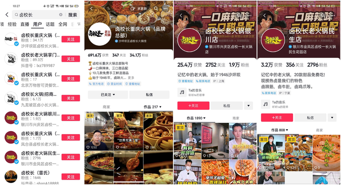 依托抖音生活服务平台的门店认领管理功能,截至到目前,卤校长的全国门店数量超过300家,已有165家门店入驻抖音生活服务平台,并相继开通门店账号。在抖音,除了@卤校长老火锅掌门人 达人账号,还有@卤校长重庆火锅(品牌 总部)品牌账号、@卤校长火锅|招商中心 招商账号 以及各区域门店官方蓝V账号,形成了规模化的卤校长抖音账号矩阵。