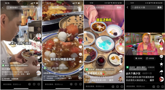 以“卤味”火锅涮品的创意为例。卤校长看到大量平台年轻用户的火锅社交需求,和传统火锅相比,卤味火锅有其特殊性,在兴趣聚合的抖音平台,卤味火锅可以找到更多志同道合的目标用户;卤校长的另一主打品类,甜品的选择也是同样的思路。甜品颜值高、品类丰富、无限畅吃等利益点的释出,“甜品永动机”既满足了解辣的火锅餐饮场景,又能直击消费痛点,在短视频的种草透传中,吸引更多消费者的心动尝试,消费者在尝试体验后会又一次分享至抖音,不断在平台沉淀卤校长的特色内容。