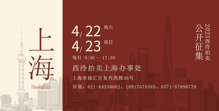 2023西泠春拍、西泠(绍兴)拍卖、西泠网拍•艺是同步公开征集,详询:021-64338662、18917675385、0571-87896778。公司杭州总部及上海办事处、北京办事处常年征集。更多信息请关注西泠拍卖官网、微信公众号“西泠拍卖”、新浪微博“西泠印社拍卖”。