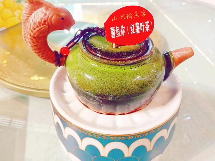 不仅如此,在研发鲟鱼宴的同时,张帆女士还将当地特色的红薯叶,变废为宝,研发了红薯叶茶。红薯叶茶参考了绿茶的加工方法,从采叶开始,到清洗、晾晒、揉搓,再到杀青、炒制、精加工,要经历十几道工序。其中,尤其要注意摊青时间、蒸制时间、炒制次数和干燥温度等关键要素,这就需要制茶工人有着丰富的制茶经验与娴熟的技艺。直到最后的收尾包装工作完成,小薯叶才能摇身一变、脱胎换骨,成为一种全新的产品红薯叶茶。在山吧鲟鱼宴中,取名薯鱼你,赢得众多好评与关注。
