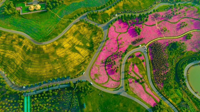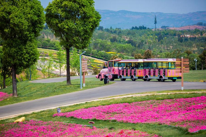 三五一丛、紧密簇拥的美女樱为大地铺就了一条玫粉色的花毯,形成独特的立体式花海景观。花海中,蝴蝶翩跹,绚烂的花朵引得游人如痴如醉,纷纷拿出手机,记录下这美好时刻。