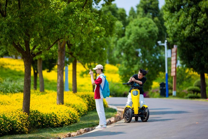 青山环抱绿水,绿水倒映青山,路旁的紫柳带来隐隐绰绰的芬芳,木春菊娇柔得随风轻轻舞动,在蓝天的映衬下,又是别样的美丽。假日期间,度假区主题IP卡通形象金琥-漠仔、闲鹅-沐哥、蔬生-小白,也将现身花海打卡点与游客嗨玩五一。