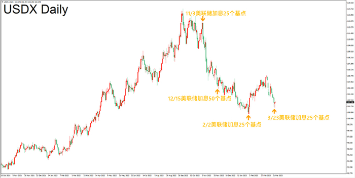 另一方面,由于美联储的紧缩政策出现逐渐放缓讯号,加息幅度有所下调,美元、实质利率中长线难以延续上行动能,此外,银行业危机也进一步压制了美联储内部的“鹰声”,多方因素结合带动金价基本面好转。