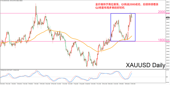 第一季度,市场迎来了“黄金时刻”。3月银行危机爆发,引发金融市场波动性显著上升,VIX指数(波动率指数)更是创下去年10月以来新高,在恐慌情绪的推波助澜下,金价一举站上2000美元/盎司高位,而此前基本维持在1800-2000美元/盎司区间波动。