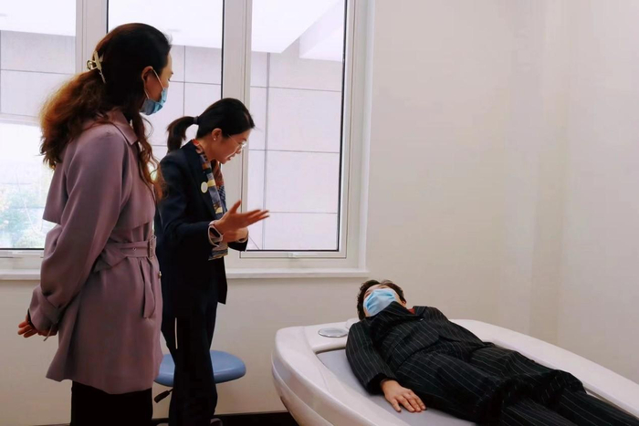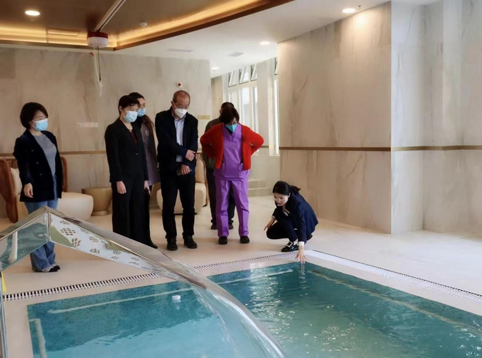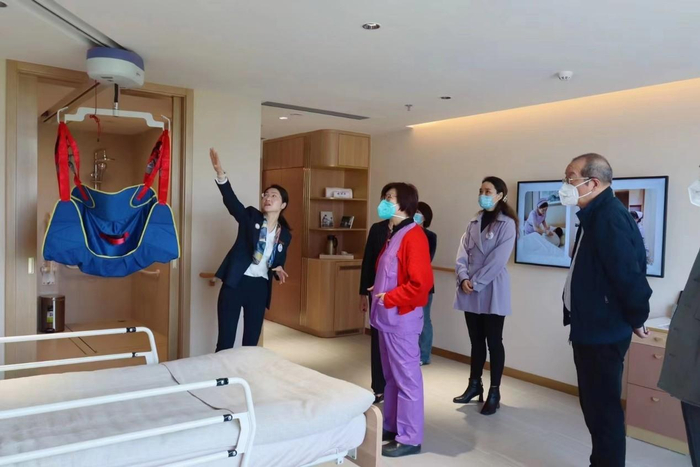 颐养中心院长王婷婷女士向各位专家们及镇领导详细讲解了机构各区的整体情况,重点介绍了失能单元样板间、医疗康复区、数字OT区、SPA水疗区,以及欧葆庭特色非药物疗法。在参观重度照护单元样板间时,王院长着重介绍了相关设施。机构重度照护单元所有的房间都配备了无障碍可移动调节的转运天轨,以更安全、舒适的方式协助长辈完成从床到卫生间的转移,减少工作人员转移长辈时发生的风险,同时提升长辈自身的舒适度。