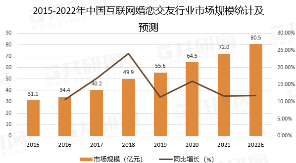 共研网《2022年中国互联网婚恋交友行业用户规模及市场规模分析》中的《2015—2022年中国互联网婚恋交友行业市场规模统计及预测》。