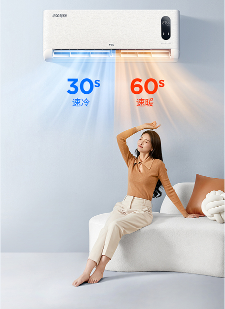 TCL小金聆智慧语音空调全新一代外机升级,风叶加大13%,搭配创新升级换热器排布方式,风量更大,换热更快,性能更强劲。TCL小金聆智慧语音空调采用全直流变频系统,结合高频速冷热技术,压缩机快速高效启动,能够达到30s速冷、60s速热的效果,回到家不必忍受闷热或寒冷,换个鞋的功夫就能拥有想要的舒适温度。