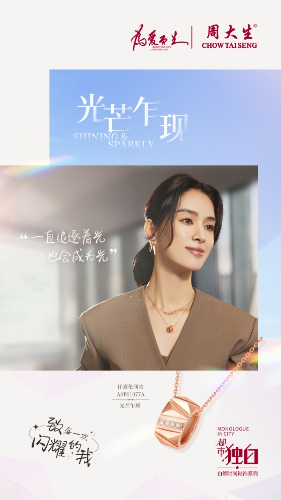 2023年4月10日,周大生珠宝正式宣布续约华语流行文化明星代表任嘉伦为品牌代言人,并重磅推出都市独白、国家宝藏两大套系新品,紧扣年轻人追求“为爱而生”的主题,携手心上“任”共同探索更多“美于形,悦于心”的珠宝精品,开启一场全新的珠宝闪耀之旅。