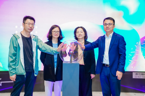 【嘉宾共同点亮启动装置。从左至右依次为:艺术家苗注雨,闵行区文化和旅游局副局长陶丽,莘庄镇党委委员、纪委书记乔宇红,上海莘天置业有限公司总经理何彬】