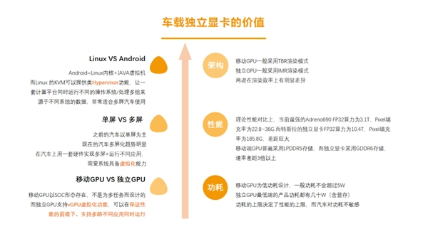 但,当智能座舱普遍渗透,车内“第三空间”深入消费者心智,参考PC、智能手机的演进历史,屏显高端化无疑为大势所趋。此时,相较于ARM架构CPU搭配着重节能的移动架构GPU(直接被集成于SOC内),X86架构CPU匹配性能强悍的桌面架构GPU支撑游戏级画面,无疑形成差异化优势。