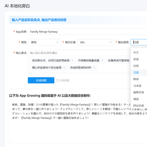 而对于手游出海场景来说,同样也面临着大量繁琐的出海内容本地化工作,利用AIGC技术来提升效率尤为必要。有米云将GPT技术与大数据库结合,在旗下AppGrowing国际版推出【AI 本地化旁白】功能模块,深化手游出海广告创意的本地化视角,提高创意迭代效率。