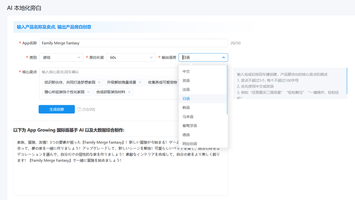 具体使用流程十分简单,只需要输入 App 名称和核心卖点,选择产品类别、旁白长度以及输出语言,AI 便会快速自动生成指定语言的文本,并且支持用户根据不同地区的需求进行个性化调整。