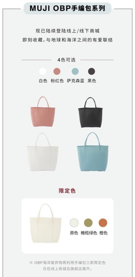 一直以来,MUJI洞察生活中的细节,从环保、节约能耗、可持续发展等视角出发开展经营活动。为了缓解海洋塑料污染这一环境问题,MUJI通过回收海洋塑料并将其作为产品原料进行再利用。此次推出的OBP海洋再生素材系列全新商品就是MUJI积极践行可持续发展理念的一项重要环保成果。MUJI将收集到的海洋废弃塑料,通过洗净、碾压、热熔的工艺再生为新的素材,并编织制成易于融入日常生活的商品。首批上市的商品为MUJI OBP海洋再生素材系列手编包,同时计划在6月份,包括T恤、沙滩鞋在内的更多OBP海洋再生素材系列新品将与中国消费者见面。