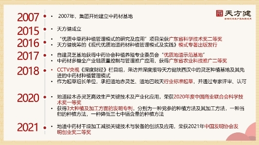 从集团在2007年建立中药材基地开始,深耕十余年,天方健对于中药材种植研究实践成果显著。天方健的种植管理模式及成果屡获多项国家、省级殊荣,并且天方健作为多项原料标准的起草组长,承担相关行业标准的起草制定。现在,天方健已经为枸杞、灵芝等几十个品种,建立上百个原材料种植基地,其中50多个基地通过了天方健种植管理模式的认证。