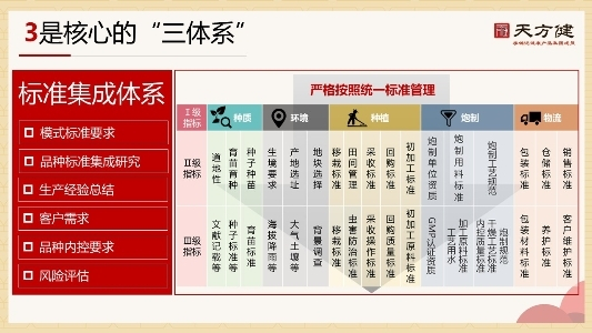天方健种植管理模式由3+4+5组成。就是三体系、四创新、五统一,这是一整套非常完整、立体的管理体系,从各个方面有力地保障种植管理模式的效果。以三体系为例,三体系包含了标准集成体系、生产运作体系、质量监控体系。其中,标准集成体系把种质、环境、种植、炮制、物流,分为1级指标、2级指标、3级指标,严格按照统一标准管理。以环境指标为例,对生态、产地、地块都有严格的要求,包括海拔降雨、大气土壤等等。