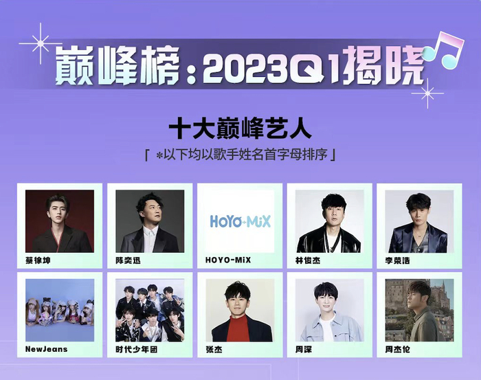 QQ音乐巅峰榜面向最年轻的乐迷人群,在年轻人的选择下指引着未来潮流音乐的风向。2023年第一季度榜单中,十大巅峰艺人被蔡徐坤、陈奕迅、HOYO-MiX、李荣浩、林俊杰、NewJeans、时代少年团、张杰、周杰伦、周深(按姓名首字母排序)包揽。乐坛新星与老牌歌手顶峰相见,可见年轻乐迷不仅被初露锋芒的新声代吸引,对资深唱将同样情有独钟。