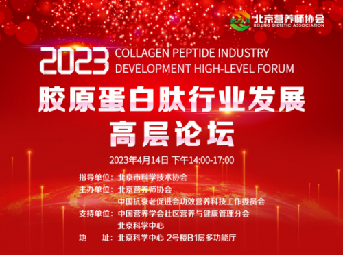 2023年4月14日,2023年胶原蛋白肽行业发展高层论坛在北京科学中心成功举办。本次论坛由北京市科学技术协会指导,北京营养师协会、中国抗衰老促进会功效营养科技工作委员会主办,中国营养学会社会营养与健康管理分会,北京科学中心支持召开。