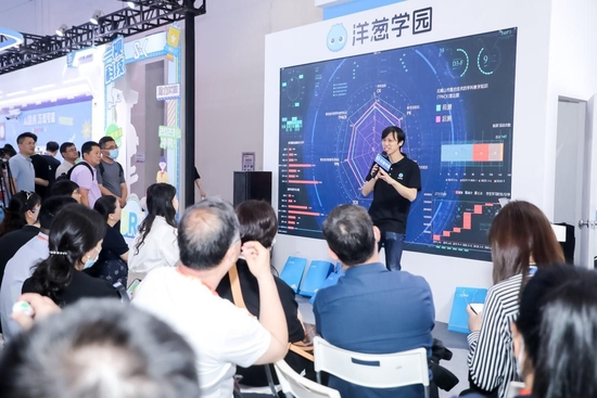 洋葱学园工作人员向现场观众介绍学生学习过程性数据监测系统