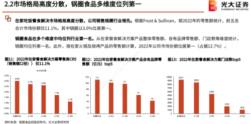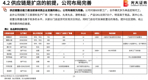 以社区餐饮“引领者”锅圈食汇为例。据光大证券发布的研报称,锅圈食汇通过“上游ODM+下游开店”的模式为消费者提供家用食材解决方案,目前在多个维度中均位列行业第一名。其建立了中国最大的一站式在家吃饭餐食解决方案网络,上游与600多家ODM工厂达成合作,产品SKU达到755个,下游以面向C端的开店模式为主,同时也积极拓展如商超、企业直销、餐厅、批发等渠道。由此可见,强大的供应链体系与管理能力是锅圈食汇产品同质价低、门店快速扩张的底气。