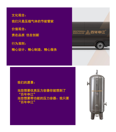 执行总监戴伟国进行了品牌战略升级宣讲,于2023年4月22日起,上海市奉贤设备容器厂有限公司正式启用“百年申江”,作为公司LOGO,用于一切品牌物料宣传。同时我们将继续坚持公司使命:为传统压力容器行业创新、赋能。愿景:当您想要优质压力容器您就西想到了“百年申江”,当您想要带功能的压力容器:我只要“百年申江”。文化观念:我们只是压缩气体的节能管家。价值观念:贵在品质,优在创新。行为准则:精心设计、精心制造、精心服务来回馈广大客户。