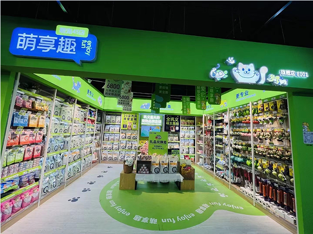 小型店主要在便利店业态落地,以单个货架或者端头形式呈现,主要满足宠物日常消耗品需求,陈列萌享趣精选主粮、零食、用品类等商品。