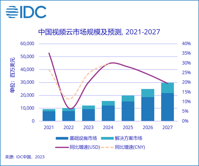 报告显示,2022下半年中国视频云市场规模达49.8亿美元,同比增长7.5%,其中解决方案市场增长达22.9%。到2027年,中国视频云市场规模预计将达到300亿美元。