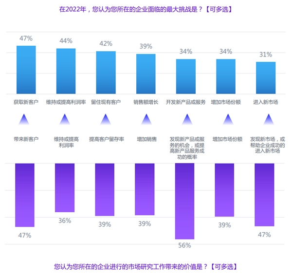 数据显示,在受访的中国企业中,认为2022年存在“获取新客户”、“维持或提高利润率”、“留住现有客户(如忠诚度)”这些挑战的比例超过40%;而认为市场研究可以帮助企业“带来新客户”、“发现新产品或服务的机会,或提高新产品服务成功的概率”、“发现新市场,或帮助企业成功的进入新市场”的比例也超过40%。