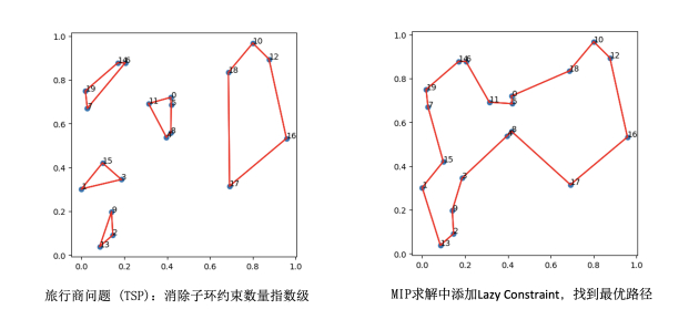 以旅行商问题(Travelling Salesman Problem,简称TSP)为例,用户可以调用Callback功能,当找到MIP可行解时,获取当前可行解的信息(判断是否包含子回路),通过添加惰性约束,交互式地消除对应的子回路。