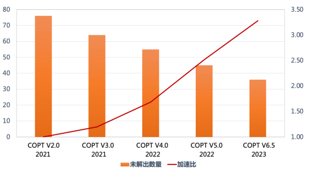 1. “未解出数量”表示在MIPLIB算例集中,COPT每次更新版本未能解出的问题数量;