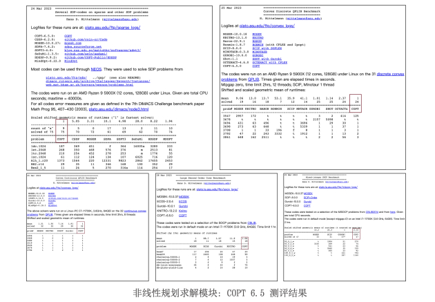 对于非线性规划问题的求解模块,COPT 6.5取得了3项第一、2项第二的成绩,各模块的测评数据如下所示: