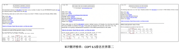 COPT 6.5版本的MIP求解性能大幅提升,在MIP测评榜的3个榜单中均排名世界第二,综合求解性能和第一名差距缩减至一倍左右,也是榜单上唯一的国产求解器。以下是COPT 6.5 MIP求解模块的测评数据: