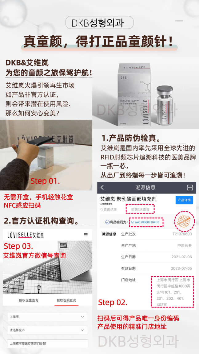 据悉,DKB引进的艾维岚是一款经NMPA认证的再生材料医美产品,相比于国外早期的PLLA材料童颜针产品,在材料本身的缺陷,包括颗粒形态,大小,复溶速度,可控降解,均匀分散,纯度等等都有所突破。同时,2021年上市的艾维岚童颜针也是中国市场上唯一一款合规合法有三类械字号的纯PLLA童颜针的产品,和国内首款采用全球先进的RFID射频芯片追溯科技的医美品牌,一瓶一芯,从出厂到终端每一步皆可追溯。