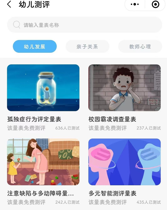 幼儿园教师及家长可通过平台手机端进行个人心理测评并生成个性化报告;幼儿也可进行心理他评。