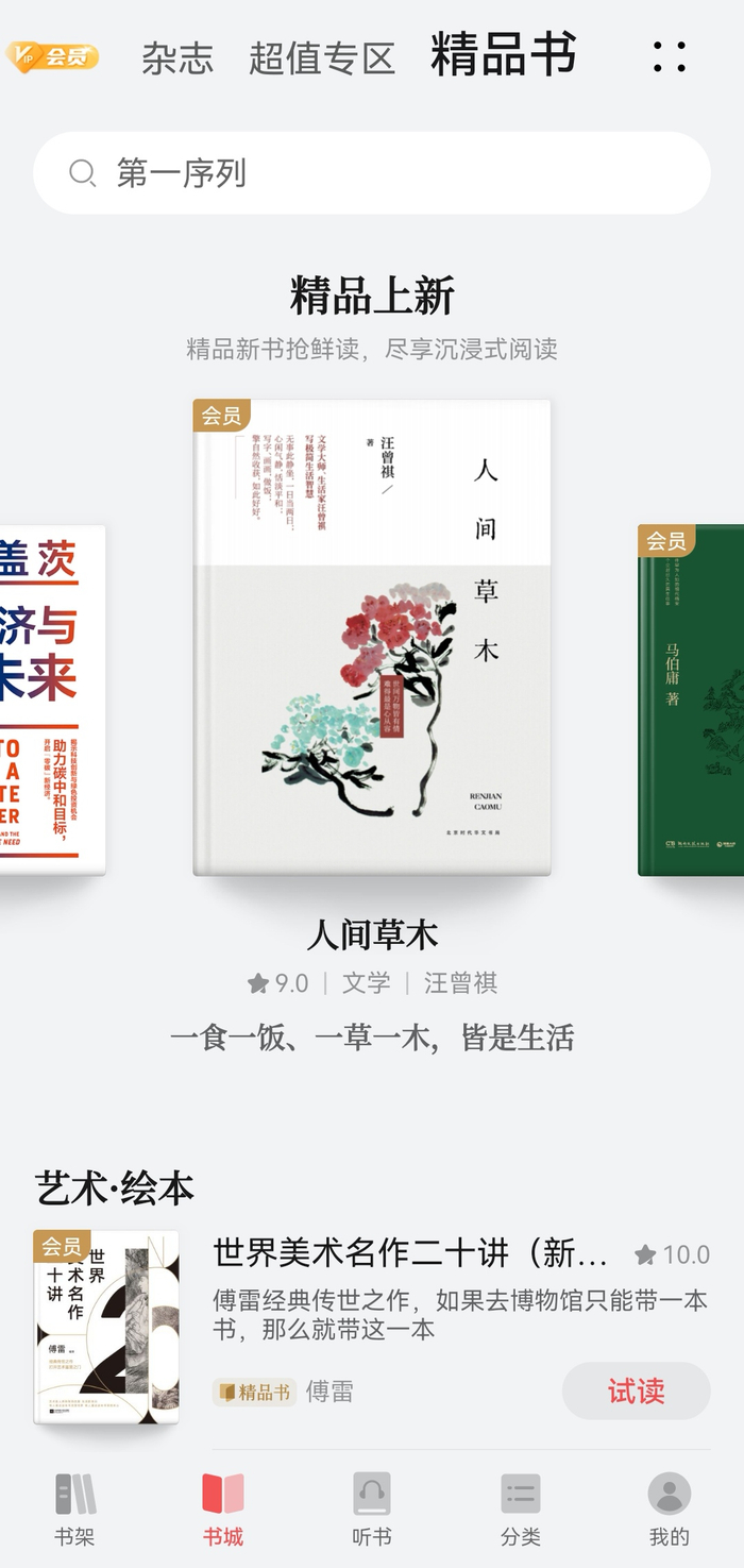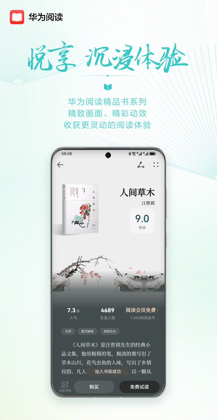 当笔者用华为阅读观看汪曾祺先生的经典小说文集《人间草木》,书籍介绍中的动态插图就很打动人,片片花瓣飘逸在风中的动效颇有意境。进入主封面,同样用微动效营造出花瓣在眼前飘落的视觉观感,透露出书中浓郁的自然气息,让文学与艺术在眼前交织呼应,比脑补画面更接近作者的原意。