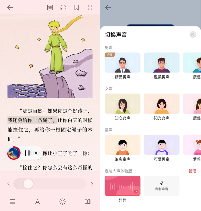 在听觉方面,华为阅读着力投入研发力量,让技术赋能艺术,实现了阅读“由看到听”的感官升维。对于每天都盯着电脑的职场白领,回到家既不想再用眼,又想读书放空自己,通过华为阅读提供的多款情感音色,特别是全新的精品音色听书,那富有情感、抑扬顿挫都十分恰当的堪比播音员朗读的效果,沉浸感十足,让用户可以很舒服地“闭目养神”吸收书中的养分。用户还可以录制声音生成专属语音包,比如我家孩子睡前喜欢听妈妈讲《小王子》的故事,万一妈妈要出差怎么办?这个时候就可以将妈妈声音提前录制生成语音包,晚上就可以用华为阅读代替妈妈给孩子讲故事了,就连语气和说话习惯都能生动还原。如果想要阅读一些外语原版的世界名著,还可以使用华为阅读的翻译功能,目前已支持50多种语言翻译,相当地方便!