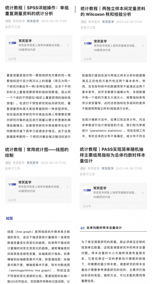 在这里小编还是强烈推荐常笑医学网的医学统计教程。常笑医学网是一家面向医生、医学生、护理人员及其他医药专业人员,提供专业的医学学术交流、科研辅助及在线医技提升等多种服务的平台。【统计教程】版块汇集了统计概述、统计方法、统计图绘制相关近百篇专业教程,讲解通俗、案例直白,能一站式满足不同阶段医学统计的学习需求。